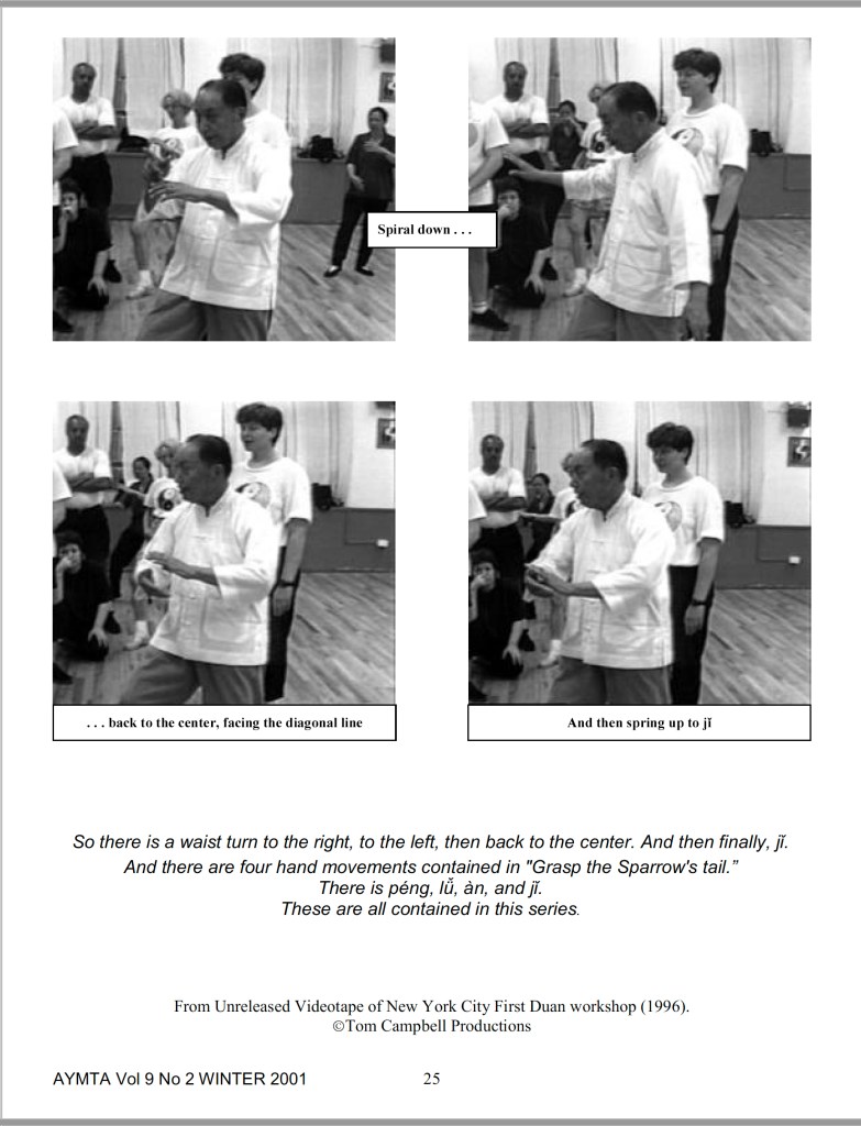 The back leg does not move or come off the ground. Shift the weight to thefront leg. Two half-steps back and shift the weight to front leg. Keep still and plunge down on the front leg and wait for the partner, then step back. The Peng hand is not doing the pushing. Draw the partner’s energy into nothing and catch the energy and throw it back.
