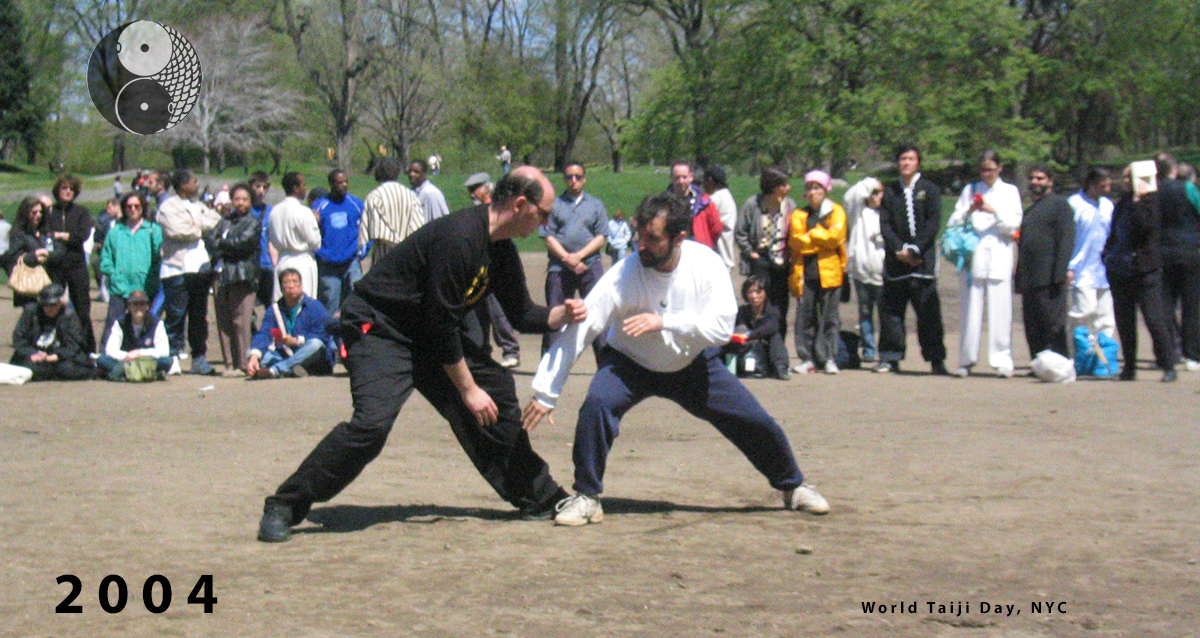 For a number of years the New York Yangjia Michuan Taiji group participated in World Taiji Day, in Central Park. Here are a few images from the 2004 event, including a second group shot and a few shots of Robert Politzer and Thomas W. Campbell demonstrating Da Lu, one of the 15 Tuishou exercises in the YMT school.