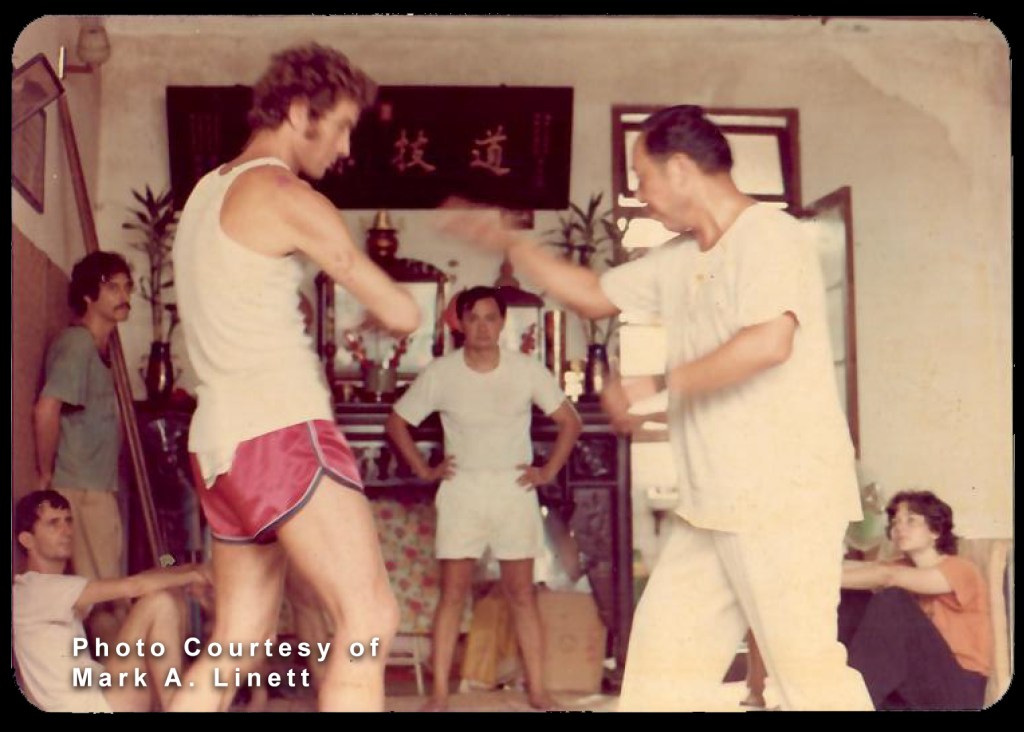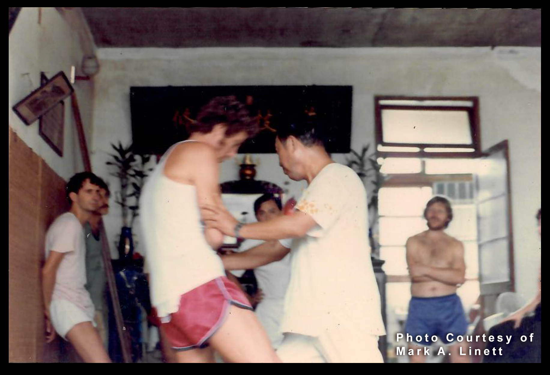 Peter Clifford practices Tuishou with Wang Yen-nien. In the back, from left to right, Mark Linett, Henri Mouton, Jean Pai, and Julia Fairchild.